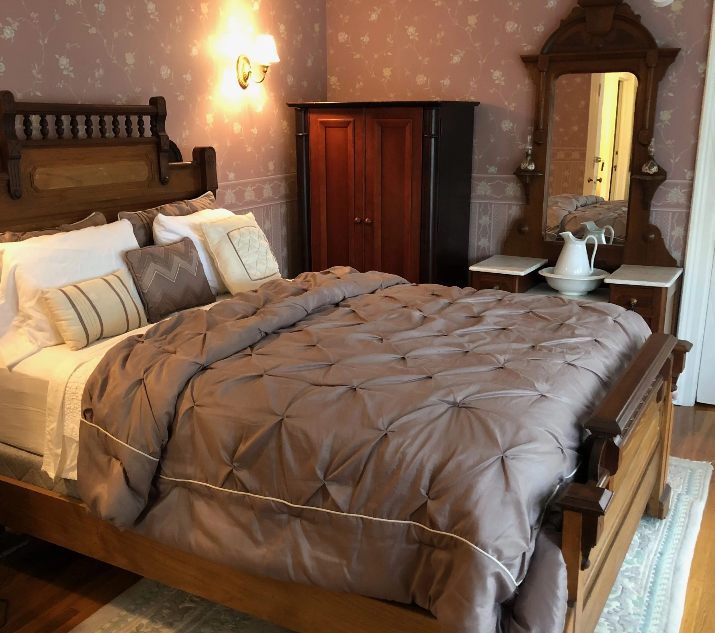 The bedroom has a queen sized antique chestnut bed. The bathroom has a glass shower, a hand honed marble floor.